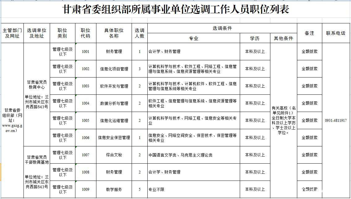 2、甘肃省委组织部所属事业单位选调工作人员职位列表