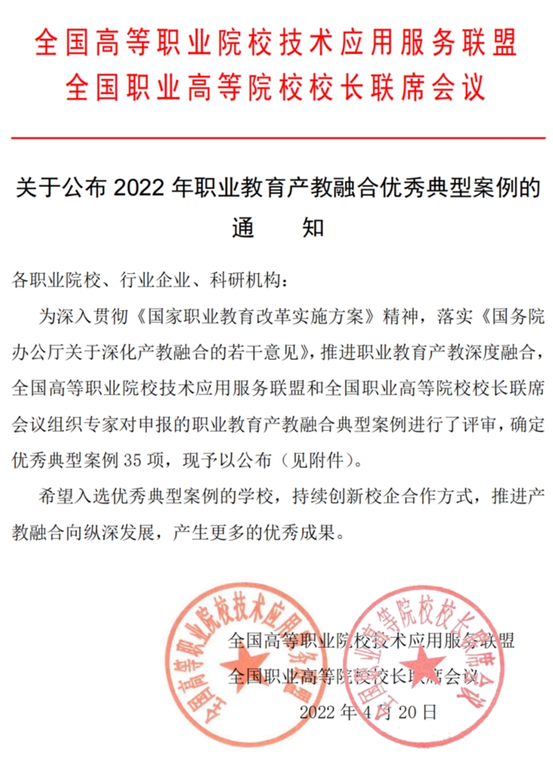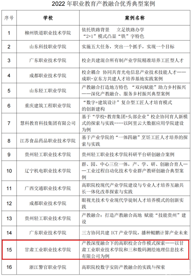 近日,全国高等职业院校技术应用服务联盟和全国职业高等院校校长联席会议公布了2022年职业教育产教融合优秀典型案例名单,Beat365报送的《产教深度融合下的高职校企合作模式探索——以甘肃工业职业技术学院和三和数码测绘地理信息技术有限公司为例》成功入选。这是Beat365在“双高”建设中取得的又一重要建设成果。