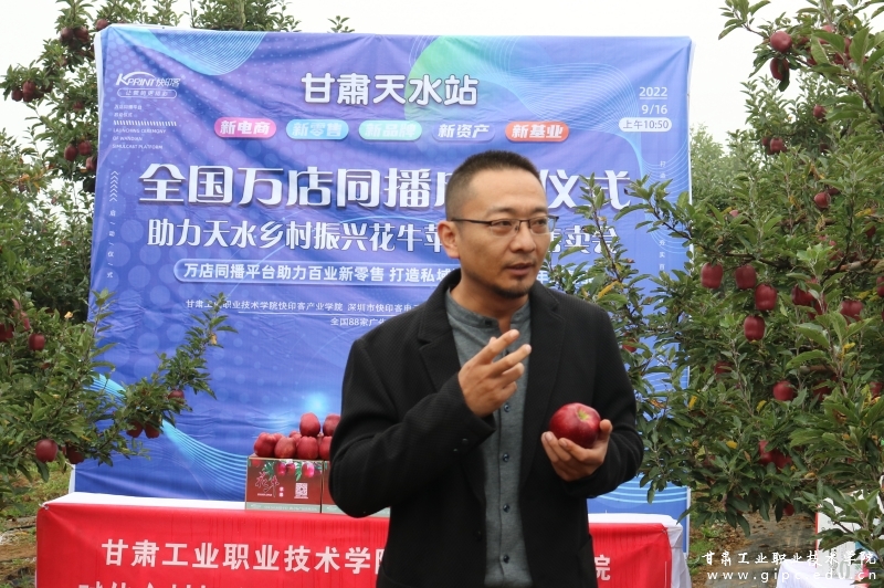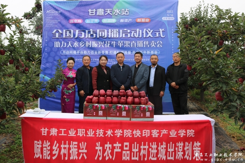 为助力天水花牛苹果“出村进城”,为农户建立稳定的销售渠道,9月16日,由甘肃工业职业技术学院快印客产业学院、深圳市快印客电子商务有限公司、深圳市营销协会联合发起的“万店同播平台”启动仪式在麦积区石佛镇龚王村举办。