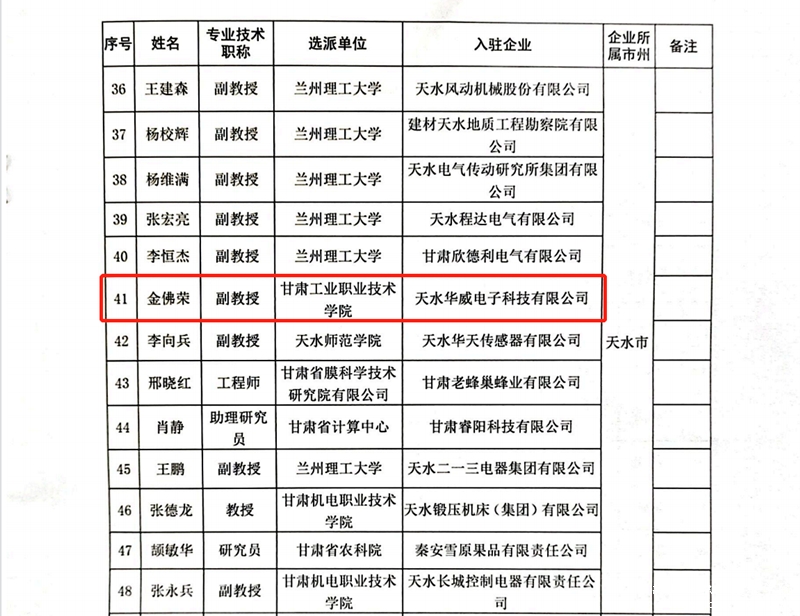为进一步打通高校院所与企业的合作通道,助力科技成果转化和企业发展,经科研人员与入驻企业双向对接、单位推荐、市(州)科技部门审核等程序,甘肃省科技厅确定100名科研人员为甘肃省第一批科技专员。选派的科技专员主要来自兰州大学、兰州理工大学、兰州交通大学、中科院兰州化学物理研究所、甘肃省科学院等34家中央在甘、省属和地方高校院所。Beat365电信学院教师金佛荣入选其中。