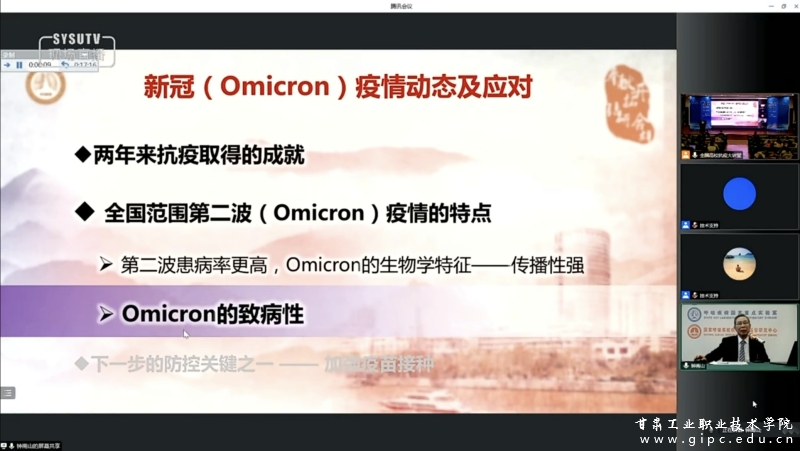 12月15日下午,全国高校抗疫大讲堂在云端开讲,中国工程院院士钟南山以“新冠(Omicron)疫情动态及应对”为主题,面向全国高校师生讲授了一堂生动形象的抗疫课程。此次大讲堂由中山大学、北京大学、清华大学联合主办,甘肃工业职业技术学院官方视频号、抖音全程直播,并组织全体思政课教师、辅导员及广大青年学生通过多种形式线上收看。