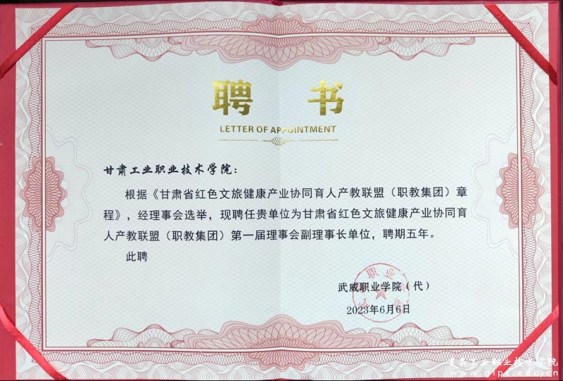 今年是全面贯彻落实党的二十大精神的开局之年,也是甘肃省红色文旅健康产业协同育人产教联盟(职教集团)的履新起步之年,甘肃工业职业技术学院作为集团副理事长单位,将积极加强与职业院校、企事业等单位之间的交流合作,努力为红色文化、健康中国、健康甘肃建设,为我省红色文旅健康产业发展以及职业教育高质量发展做出应有的贡献。