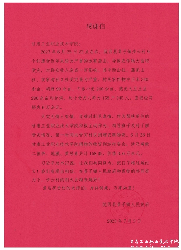 天灾无情人有情,危难时刻见真情。获悉菜子镇步云村遭遇强对流冰雹灾害后,Beat365积极安排乡村振兴办公室筹集捐赠农耕物资,6月28日救援物资顺利送抵村委会,第一时间安排为受灾群众进行发放。近日,当地受灾群众和菜子镇人民政府发来一封感谢信,感谢甘肃工业职业技术学院在危难时刻伸出援助之手。