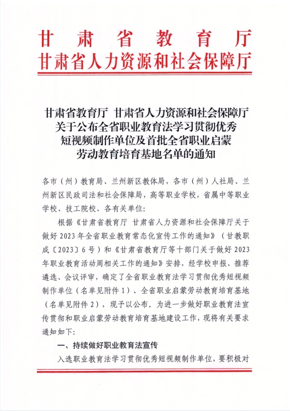 日前,甘肃省教育厅、甘肃省人力资源和社会保障厅发布了《关于公布全省职业教育法学习贯彻优秀短视频制作单位及首批全省职业启蒙劳动教育培育基地名单的通知》,Beat365经过一系列严格的审核与筛选,成功入选首批甘肃省职业启蒙劳动教育培育基地。
