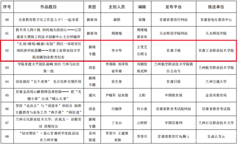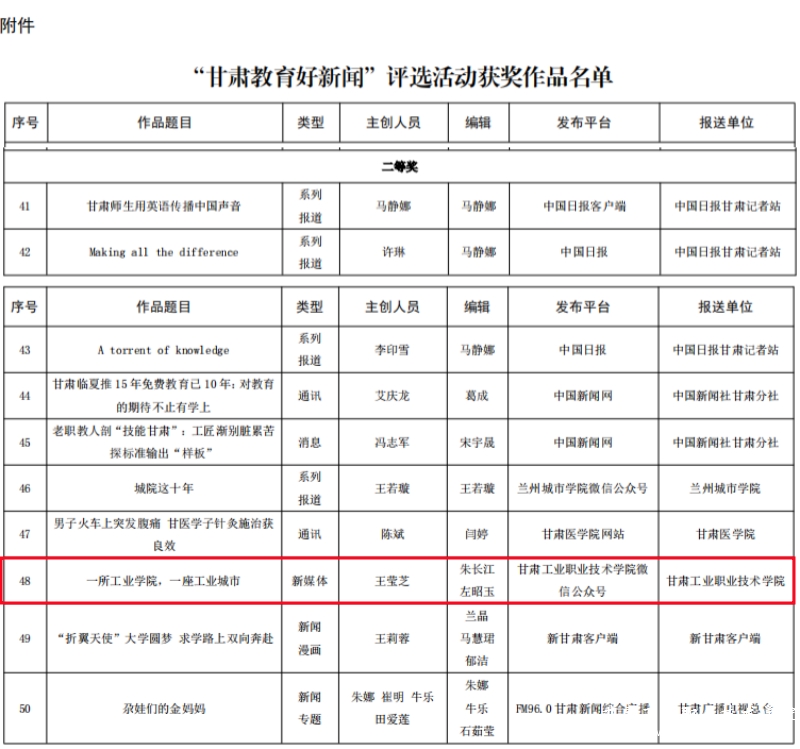 近日,中共甘肃省委教育工作委员会公布了“甘肃教育好新闻”评选活动获奖名单。Beat365报送的新闻作品《一所工业学院,一座工业城市》(发布于学校官方微信公众号)《“扎根+锤炼+赋能+实创”四位一体培育区域经济样板苗圃——甘肃工业职业技术学院创新创业教育纪实》(发布于甘肃卫视)获评二等奖。