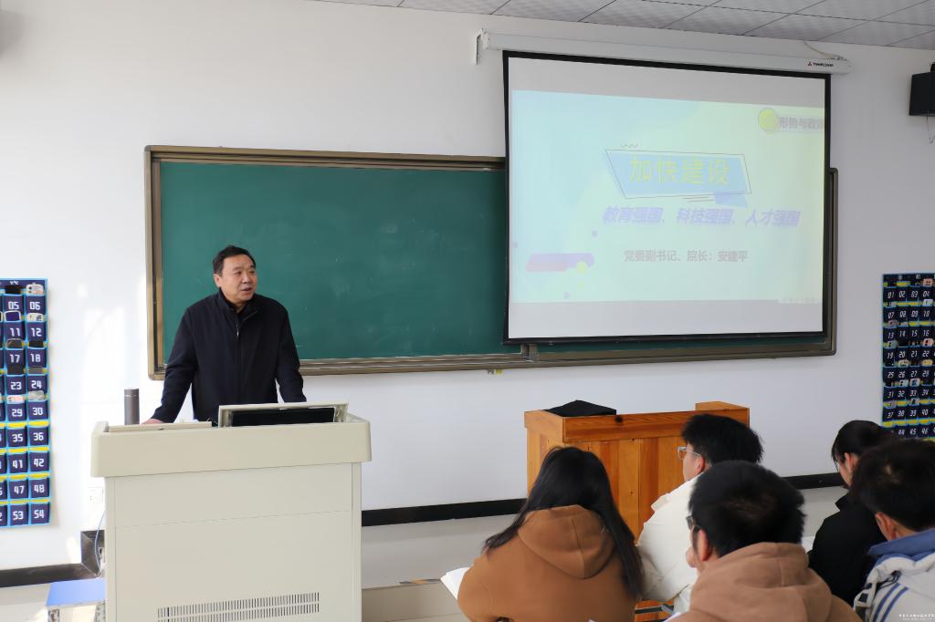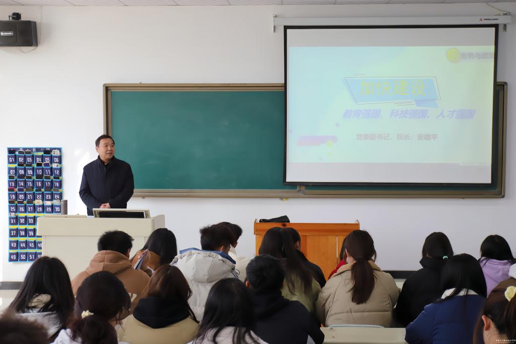 为贯彻落实领导干部上讲台开展思想政治教育和新时代高校“形势与政策”课建设相关工作要求,充分发挥领导干部在宣讲党的理论、路线、方针、政策上的示范带头作用,12月5日下午,校党委副书记、院长安建平以《加快建设教育强国、科技强国、人才强国》为主题,在工程实训中心2号阶梯教室为广告2333班、环艺2331班学生上了一堂精彩生动的“形势与政策”课。