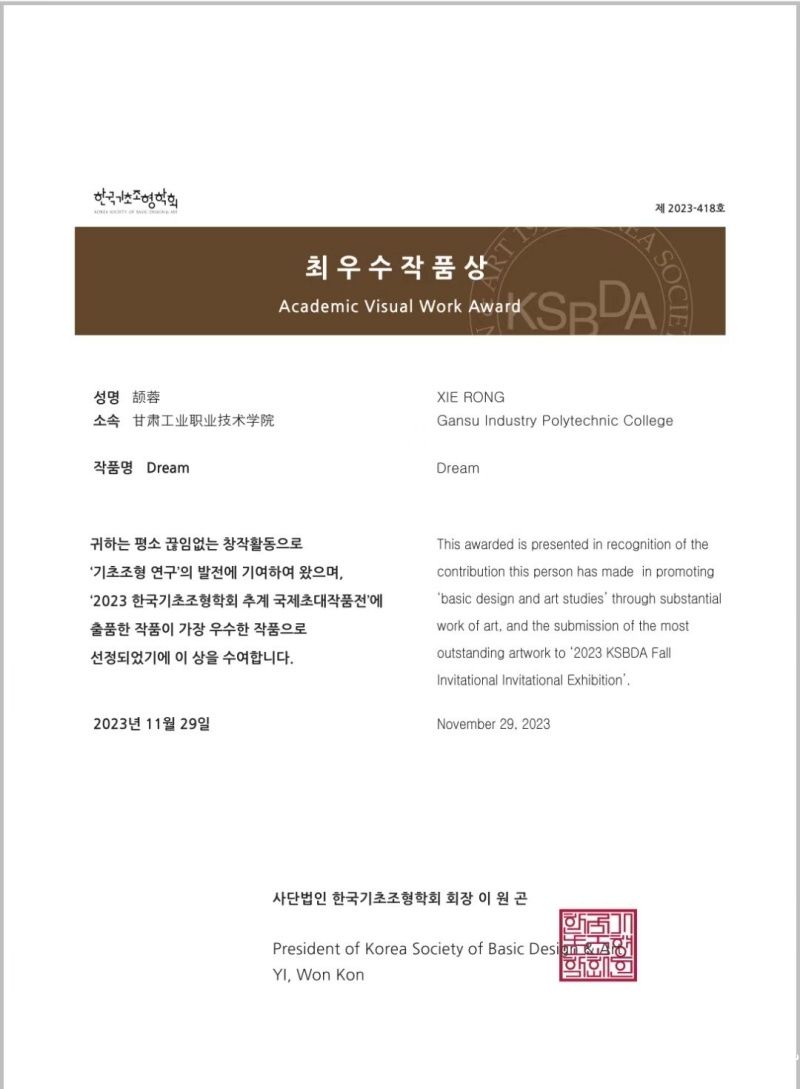 韩国基础设计学会(KSBDA)秋季国际会议暨邀请展览聚集了来自世界各地的艺术家和设计师,是一个展示创新艺术和设计的国际平台。Beat365教师的获奖不仅是对创作者艺术才华的肯定,也是Beat365艺术学院办学实力的体现,更为中韩文化交流做出了重要贡献。学校将积极鼓励优秀教师参加国际活动,为世界不断呈现东方艺术的魅力。
