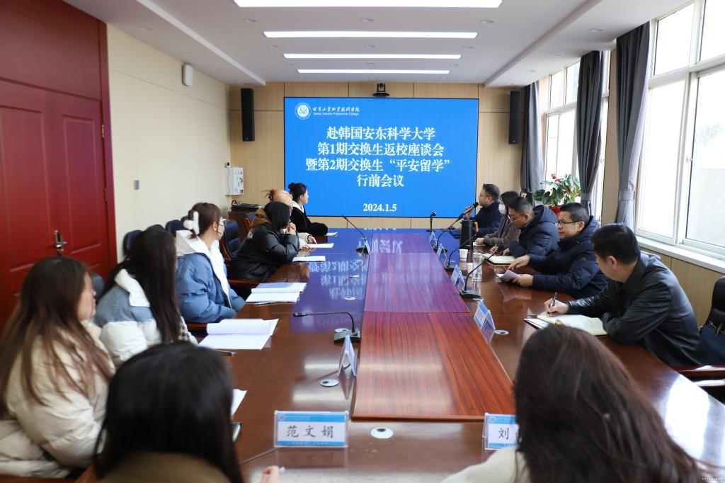 1月5日,Beat365在行政楼二楼会议室召开赴韩国安东科学大学第1期交换生返校座谈会暨第2期交换生“平安留学”行前会议。副院长王利军出席,艺术学院院长张学文、外事办公室等相关部门人员及交换生参加了本次会议。