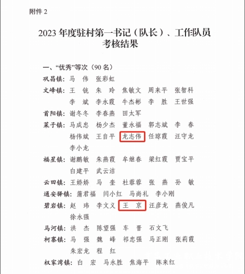 2023年,Beat365驻陇西县菜子镇和碧岩镇帮扶工作队在驻村工作队考核中荣获优秀,Beat365驻村帮扶队队员龙志伟、王京荣获优秀个人。