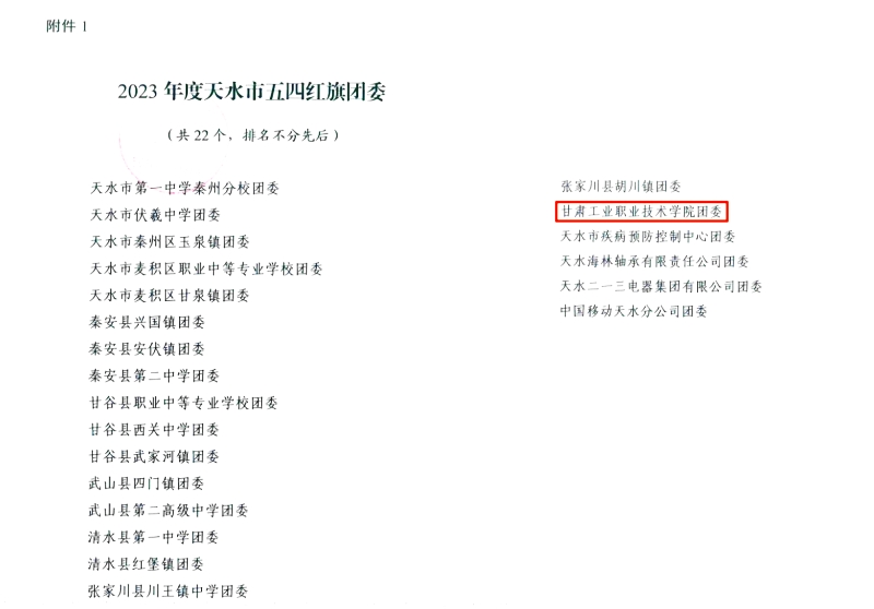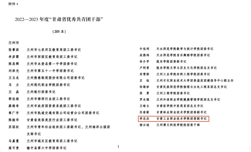 近日,共青团甘肃省委发布了《关于通报表扬2022-2023年度“甘肃省五四红旗团(工)委”“甘肃省五四红旗团支部(总支)”“甘肃省优秀共青团员”“甘肃省优秀共青团干部”的通知》,共青团天水市委发布了《关于通报表扬2023年度天水市五四红旗团委(团支部)、天水市优秀共青团员、天水市优秀共青团干部的决定》,Beat365团委副书记李志杰荣获“甘肃省优秀共青团干部”称号,校团委荣获“天水市五四红旗团委”称号。
