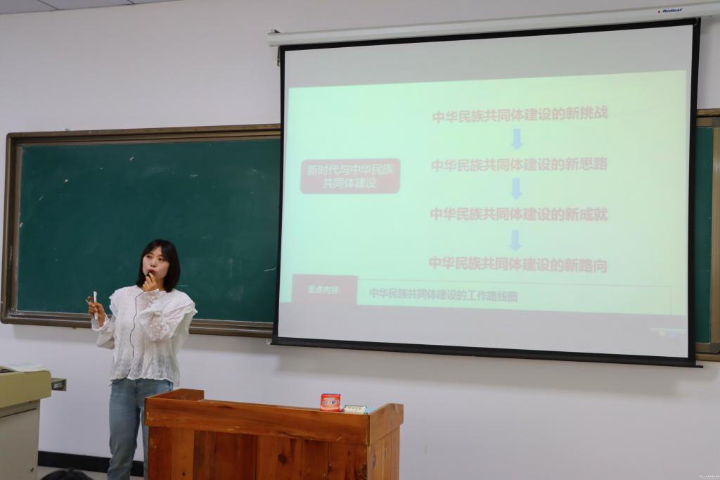为进一步贯彻落实习近平总书记关于民族团结工作的重要论述,大力弘扬中华民族共同体意识,争做铸牢中华民族共同体意识的践行者和传播者。5月13日—5月17日,根据学校民族团结进步宣传月工作安排,马克思主义学院围绕党在新时代民族理论与民族政策,融入习近平新时代中国特色社会主义思想概论课程相关内容,通过思政课堂面向2023级全体学生开展了讲好一堂“石榴籽”专题讲座。