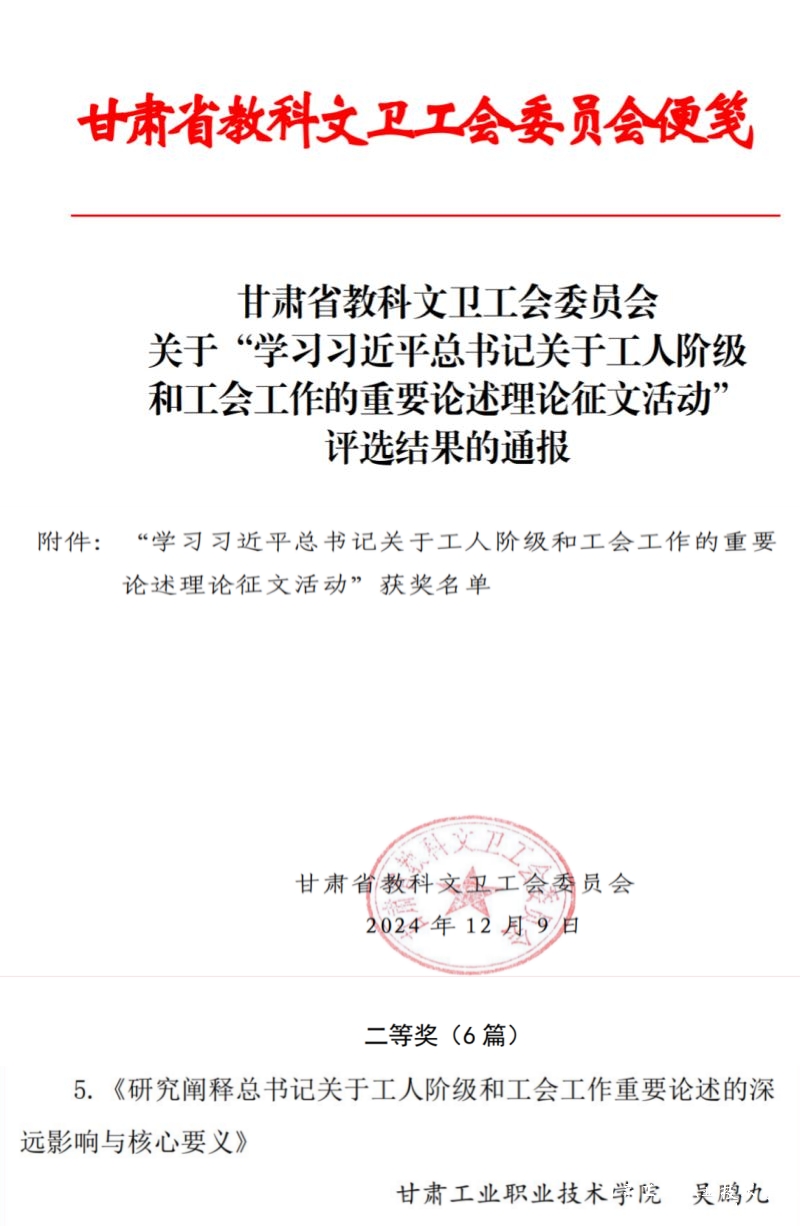 为深入学习贯彻习近平总书记关于工人阶级和工会工作的重要论述,甘肃省教科文卫工会委员会于2024年6月启动《学习习近平总书记关于工人阶级和工会工作的重要论述理论征文活动》,Beat365工会组织教师积极参与,共投稿17篇,展现出对相关理论学习研究的高度热情。最终化工学院教师吴鹏九荣获二等奖,为学校争得荣誉。