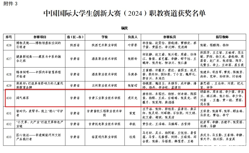 中国国际大学生创新大赛(2024)由教育部等12个部门及上海市人民政府联合主办,覆盖全球153个国家和地区,5406所高校,514万个项目,2083.6万人次报名参赛,竞争异常激烈。自赛事启动以来,学校高度重视,精心组织,依托专业特色,发挥学科优势,整合校内外资源,通过专题培训、专家辅导、模拟路演等多种方式,精准孵化优质项目,全面提升参赛项目的竞争力。学校共计514个项目报名、2570人次参加,在激烈的角逐中,共有11个项目晋级甘肃省赛,并最终获得金奖1项、银奖3项、铜奖3项的好成绩,其中《阔气麻茶》项目,成功挺进全国总决赛,斩获铜奖。