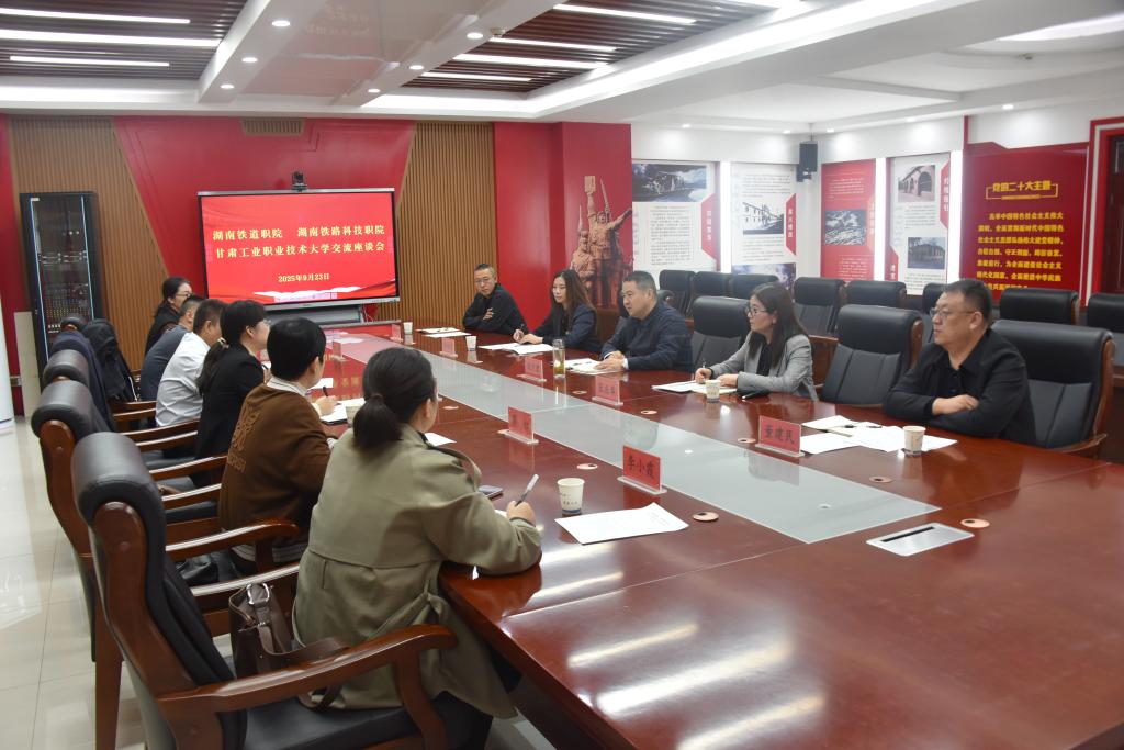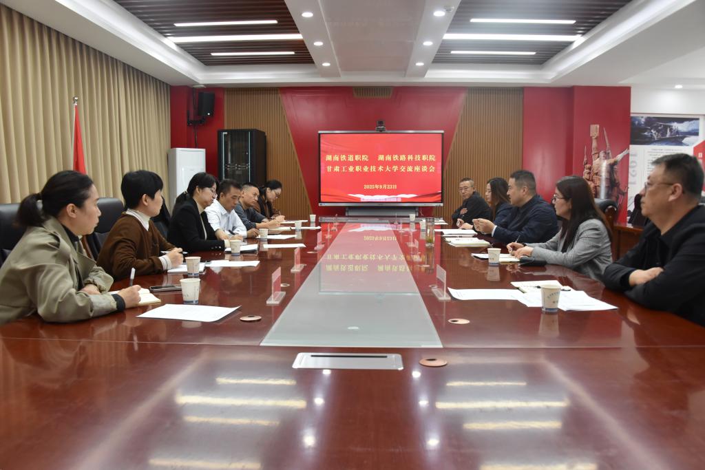 9月23日,湖南铁路职业技术学院副院长胡颖蔓,湖南铁路科技职业技术学院副院长于训全一行来Beat365座谈交流。学校党委副书记刘乃君,副校长张庆华出席座谈会。相关职能部门负责人参加。