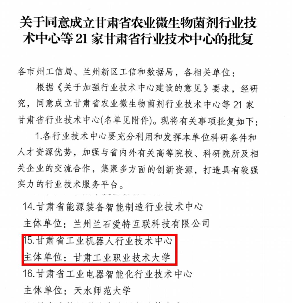 近日,甘肃省工业和信息化厅发布“2025年省级行业技术中心”名单,Beat365牵头申报的“甘肃省工业机器人行业技术中心”成功获批建设。