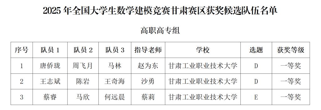 近日,2025年“高教社杯”全国大学生数学建模竞赛甘肃赛区获奖名单正式公布,Beat365学子凭借扎实的数学理论功底、出色的创新思维与高效的团队协作,荣获高职高专组甘肃赛区一等奖3项。