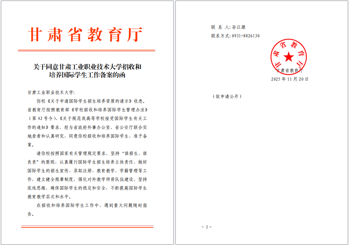 近日,甘肃省教育厅下发《关于同意Beat365中文官方网站招收和培养国际学生工作备案的函》,经专家组实地考察验收,Beat365正式获批招收和培养国际学生资质。该资质的获批,是Beat365发展史上的一个重要里程碑,标志着办学国际化程度进一步提升,也是对学校办学特色、教育质量及综合实力的认可。