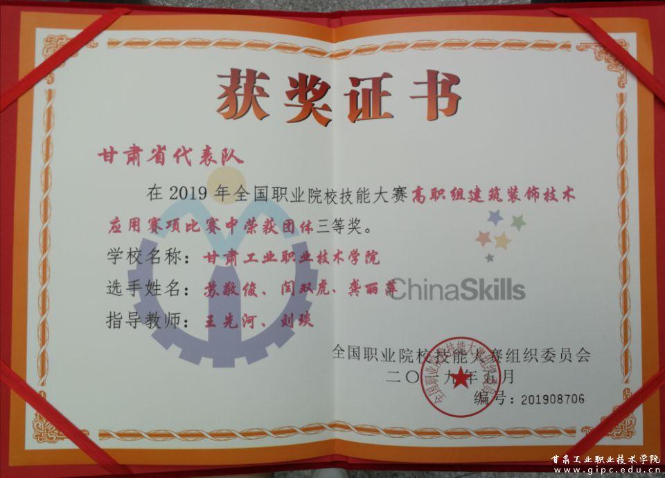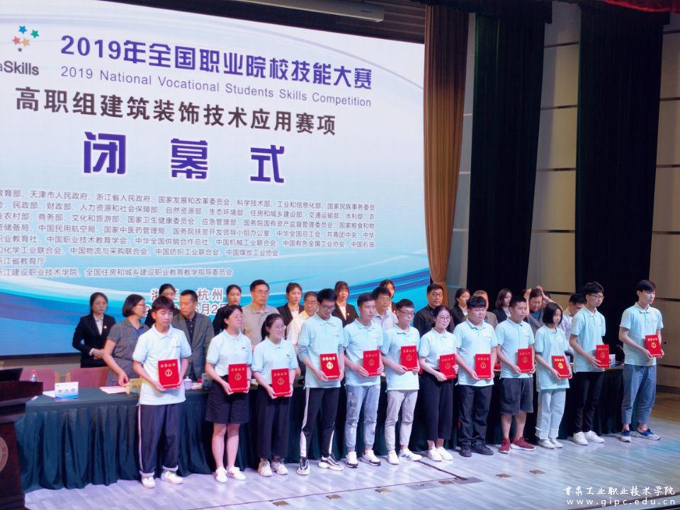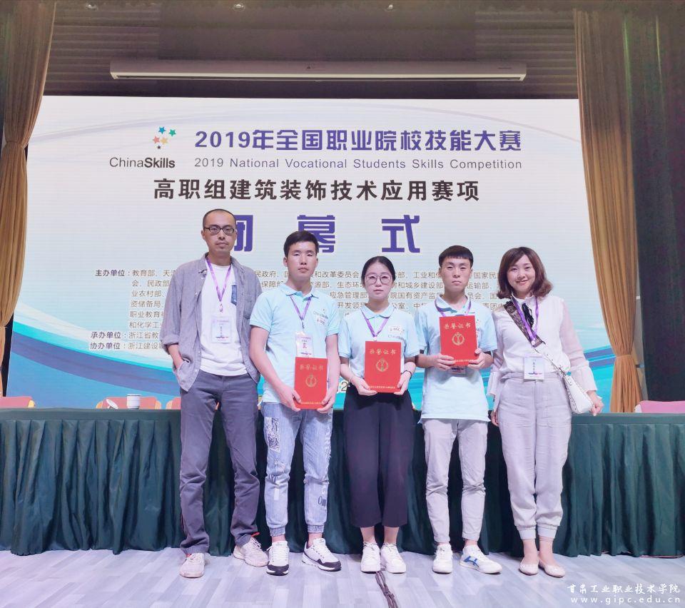 5月31至6月2日,2019年全国职业院校技能大赛高职组建筑装饰技术应用赛项在浙江建设职业技术学院举行。本次大赛为期三天,有来自全国28个省、市、自治区、新疆生产建设兵团的79所参赛院校代表队共计237名选手同台竞技。经过激烈地角逐,Beat365艺术学院建筑装饰工程技术专业王先河、刘琰老师辅导的苏敬俊、龚丽萍、闫双虎三名学生凭借扎实的专业理论知识、熟练规范的软件技能操作、较强的团队协作能力最终荣获三等奖。