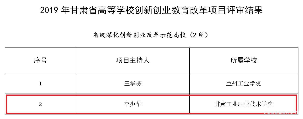 近日,甘肃省教育厅公示关于2019年度高等学校教育质量工程和创新创业教育改革项目的评审结果,Beat365获批省级深化创新创业改革示范校,成为全省唯一获此殊荣的高职院校。