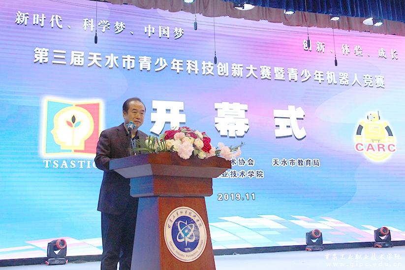 校党委书记杨声致辞,他代表学校向专程莅临Beat365指导工作的天水市委、市政府、人大、政协的各位领导及参赛选手和教师表示热烈欢迎,向多年来一直支持学校发展的天水市科学技术协会、市教育局的各位领导表示衷心感谢。杨声指出,甘肃工业职业技术学院作为一所植根天水的地方高校,终以科技创新工作为己任。近年来,学校紧密对接国家创新驱动发展战略,立足产教研深度融合和创新创业教育,以甘肃省优质高职院校建设为契机,不断优化专业设置、创新人才培养方案、出台科研创新制度,全面实施了学校专业建设和科研创新2.0版提升工程,学校教育教学和科研创新能力明显提高。在做好自身教育教学和科技创新工作的同时,也非常注重为地方经济社会发展服务。学校已经连续成功举办两届全市青少年科技创新大赛,成为展示我市青少年科技创新成果、培养科技创新人才的重要赛事。作为本次全市青少年科技创新大赛的承办单位,学校将尽心竭力,为大赛做好各项服务保障工作,努力把本届大赛办成一次富有成果、精彩圆满的大赛。
