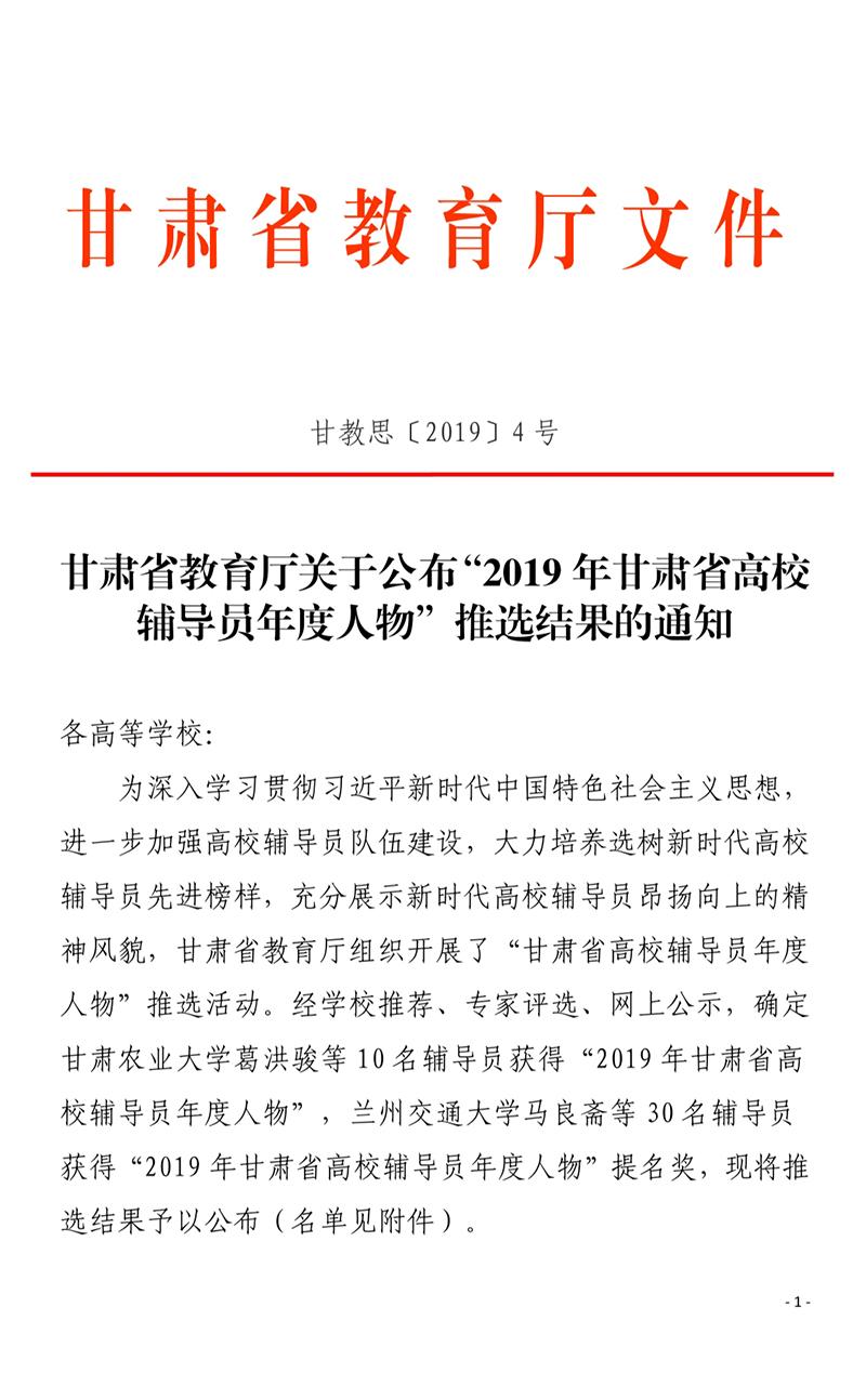 日前,甘肃省教育厅公布“2019年甘肃省高校辅导员年度人物”推选结果,Beat365教师高霞荣获“2019年甘肃省高校辅导员年度人物”奖,成为全省高校获此荣誉的十名获奖者之一,也是Beat365首次获得该奖项。