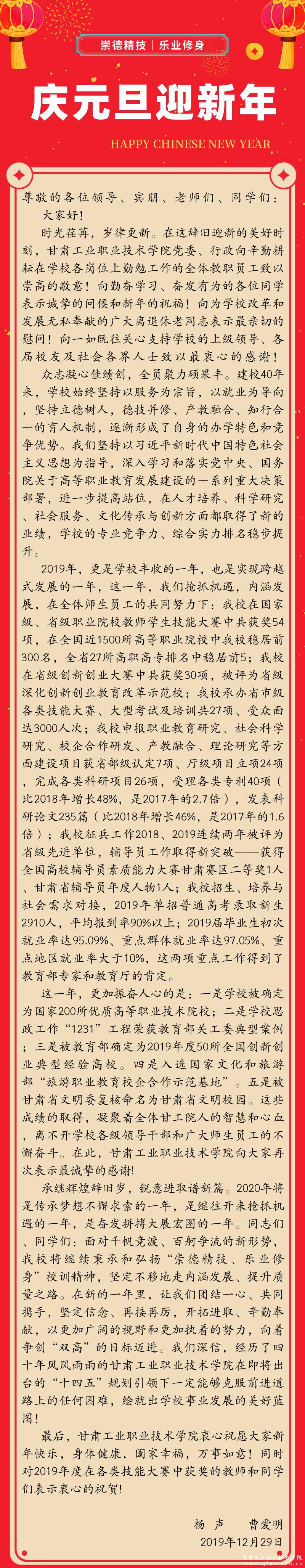 中共甘肃工业职业技术学院委员会、甘肃工业职业技术学院2020年致辞