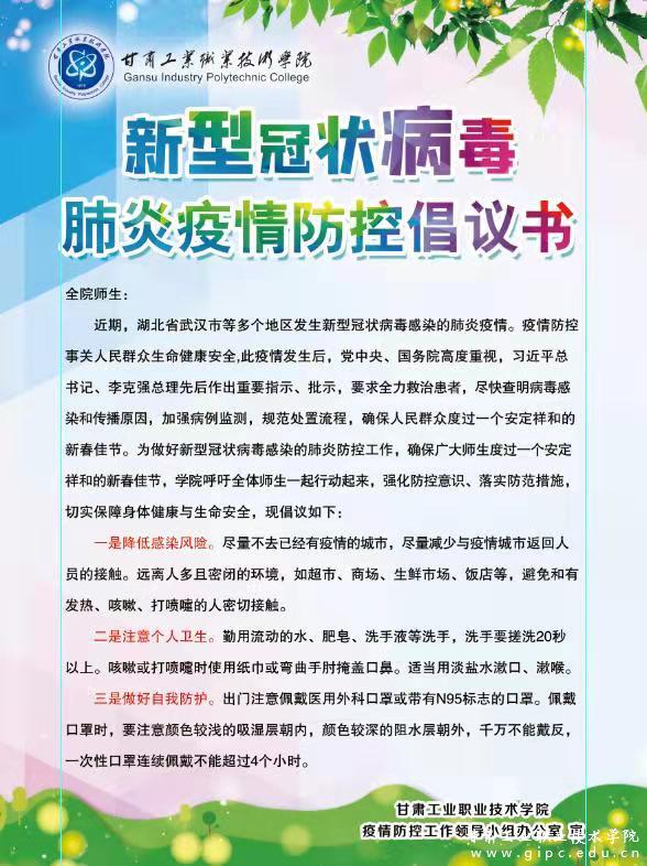 万众一心,众志成城,防控疫情。我们坚信,在学校党委、行政的坚强领导下,在学校各部门、各二级学院及广大师生的大力支持下,齐心协力,群防群控,积极参与到新型冠状病毒感染肺炎的防控之中,将“每个人是自己健康第一责任人”的理念时刻铭记于心,把投身防控疫情工作作为践行初心使命、体现责任担当的“实战场”,凝聚力量,打赢疫情防控阻击战。