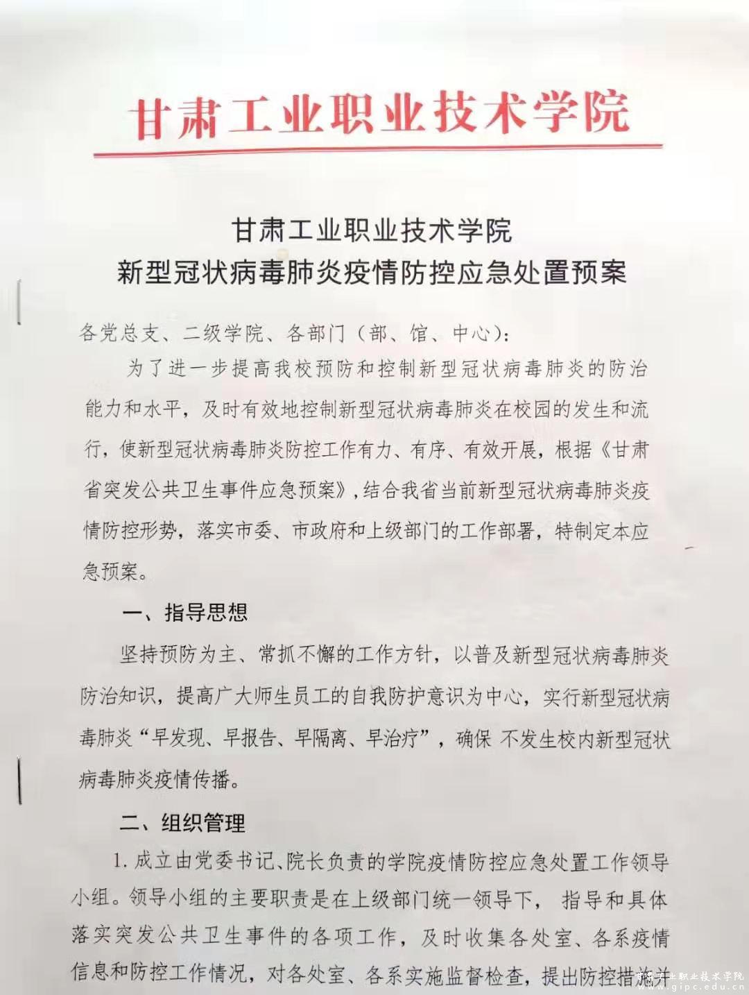 践行初心使命,体现责任担当,投身疫情防控阻击战。疫情发生以后,学院成立了学院党委书记、校长任双组长的“新型冠状病毒感染的肺炎联防联控工作领导小组”,负责全院疫情防控的组织协调和统筹调度。成立了《甘肃工业职业技术学院预防新型冠状病毒感染的肺炎疫情防控领导小组》,制定了一系列疫情防控工作制度、应急方案、公告等,凝聚全院师生力量,全力做好疫情防控工作。