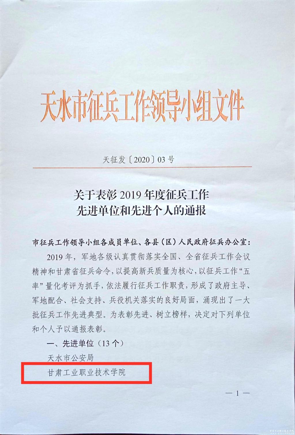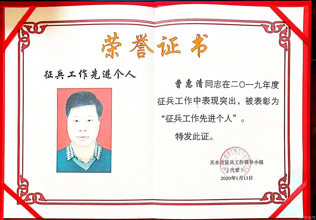 日前,Beat365被天水市征兵工作领导小组评为“2019年度天水市征兵工作先进单位”,曹惠清同志被评为“2019年度天水市征兵工作先进个人”。