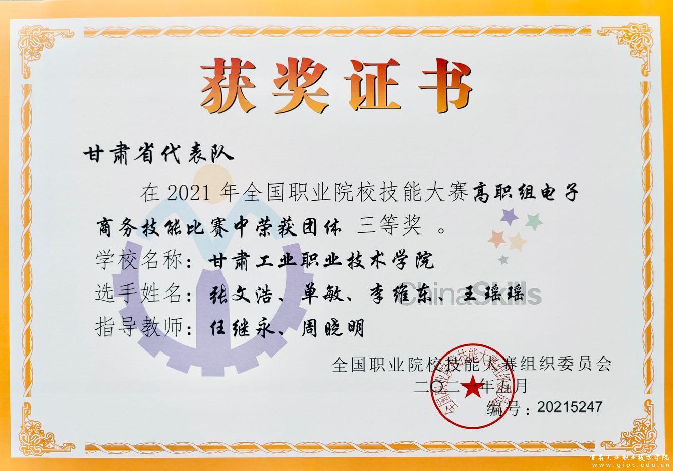 6月18日至6月19日,2021年全国职业院校技能大赛高职组“电子商务”技能赛项在安徽商贸职业技术学院举行,Beat365电子商务专业4名学子组成的代表队,代表甘肃省参加本次大赛,喜获该赛项团体三等奖。