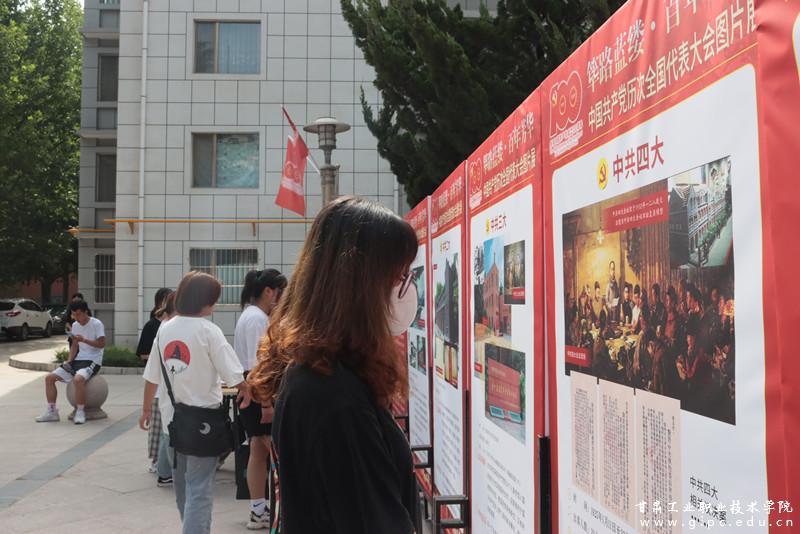 在大学生活动中心前,有22块宣传板十分醒目。庆祝中国共产党成立100周年的活动标识及内容解读让人心生肃穆,图文并茂的中国共产党历次代表大会的简介和党领导下取得的社会主义建设的伟大成就让人激动、自豪。行者驻足、观者深思,中国共产党的百年历程,就是团结带领人民为实现中华民族伟大复兴而接续奋斗的历程。