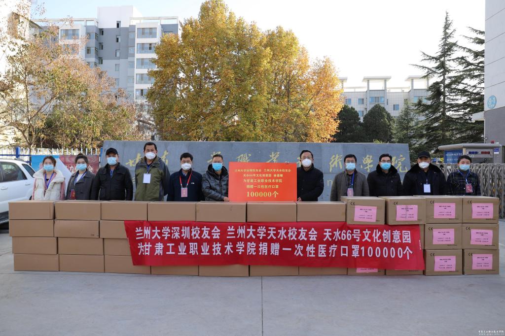 11月8日,兰州大学深圳校友会、兰州大学天水校友会、天水66号文化创意园徐嘉敏向学校捐赠医用外科口罩10万只。