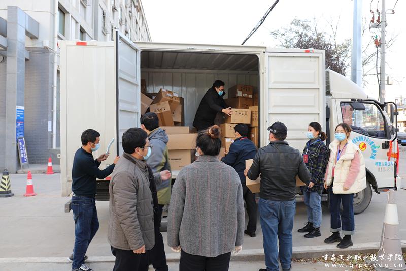 捐赠物资在防疫办、保卫处及校团委志愿者的帮助下,以最快的速度完成了物资的卸货、消杀、清点工作。