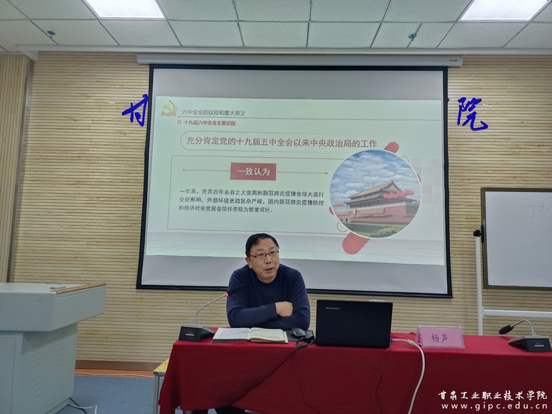 12月8日,学校党委书记杨声在旅游学院作学习贯彻党的十九届六中全会精神专题党课。旅游学院全体党员和入党积极分子参加,党支部书记曹瑞琴主持。