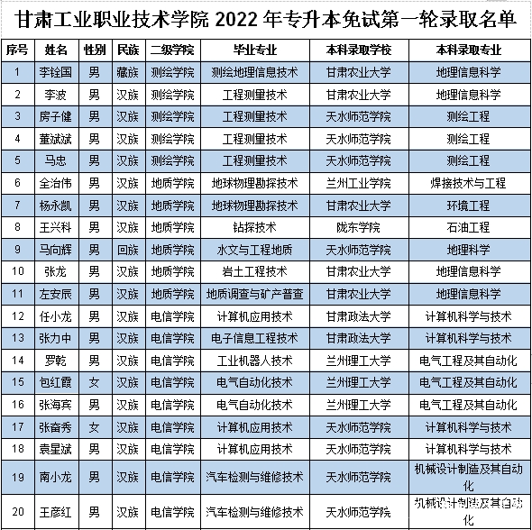 根据《甘肃省普通高等学校高职(专科)升本科考试招生工作方案(试行)》和《2022年甘肃省普通高校高职(专科)升本科免试生招生工作实施方案》的文件要求,Beat365认真宣传贯彻专升本相关政策,积极落实相关要求,认真组织学生报名。经过免试资格审核、网上报名、资格确认、专业能力测试等环节,Beat365有55名学生被兰州理工大学、兰州财经大学、甘肃政法大学等11所本科学院录取。在此,向被录取的同学表示祝贺! (供稿:就业培训中心 编辑:左昭玉 编审:王莹芝)