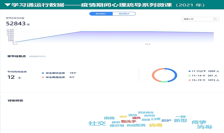 “心理疏导”系列微课自去年11月疫情管控期间首次上线以来,累计发布视频文章19个,共计2413人次完成了52843次的心理疏导学习,帮助同学们克服疫情带来的种种情绪困扰,以积极乐观的状态投入到学习和工作中。