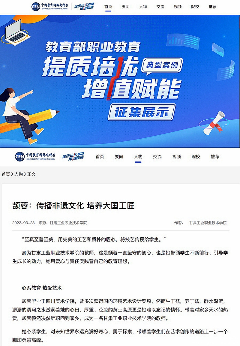 “提质培优”项目建设期间,学校围绕“教书育人”、“落实提质培优行动计划”等主题,向教育部报送 “传播非遗文化 培养大国工匠——颉蓉老师教书育人典型事迹”、“引领1+X证书建设、树技能甘肃典范——测绘学院与天水三和数码校企深度合作典型案例”等共4项工作案例。在案例组织申报期间,得到学校领导和艺术学院、测绘学院、旅游学院、双创学院的大力支持。学校将以此次入选“提质培优增值赋能典型案例”为契机,在提升教学水平、强化职业素养,打造技能传承、培养工匠精神上持续发力,切实有效地推进地方非遗文化传承,推动人才培养工作高质量发展。