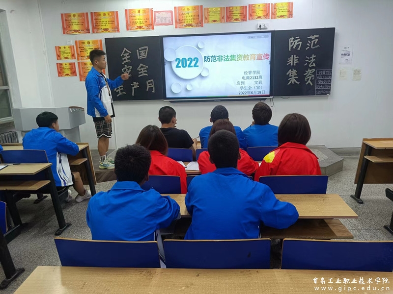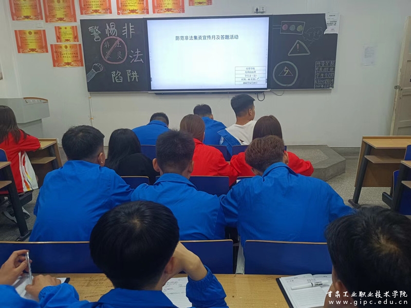 活动过程中,通过发布宣传资料、信息展板、校园广播等多种方法进行广泛宣传,并于6月19日晚,在二号教学楼开展了以“防范非法集资宣传月”为主题的班会活动,做到在校学生全覆盖。