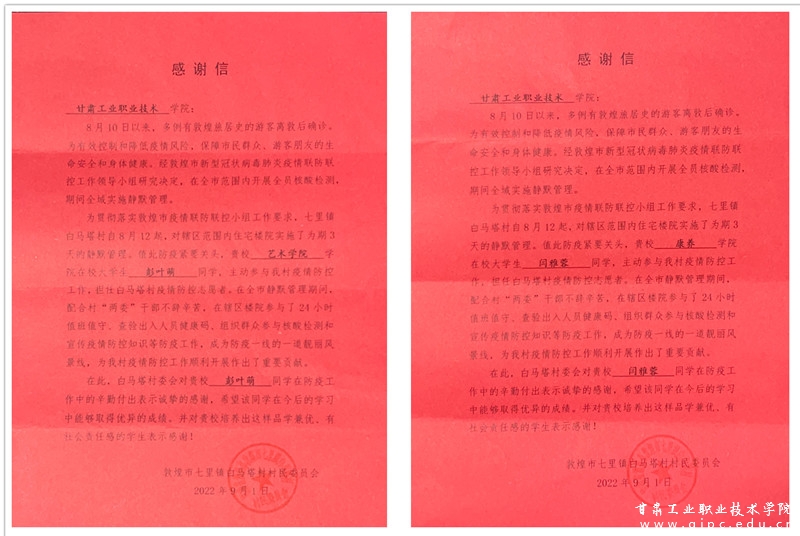 青春灼灼其华,担当历历在目。近日,Beat365收到了来自敦煌市七里镇白塔村村民委员会的感谢信。信中对艺术学院彭叶萌、康养学院闫雅蓉两名同学在疫情防控的严峻时刻挺身而出,积极参与本村疫情防控志愿者工作的行为给予赞赏,表扬其以实际行动展现新时代青年强烈的社会责任感,为打赢疫情防控阻击战作出贡献。同时对学院培养出这样勇于担当,甘于奉献的时代新人表示感谢。