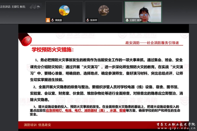 在一个多小时的讲座中,王爱红通过近年发生的多起重大火灾事故及校园火灾案例视频,用触目惊心的画面和数字让在座的师生深受震撼,让大家深刻认识到“隐患险于明火、防范胜于救灾”的重要性。讲座上,她还分享了消防法律法规、消防基本常识和常见火灾的燃烧原理及扑救措施等消防知识,并同大家一起探讨了消防器材使用、火灾扑救、火灾预防和火灾中的自救逃生等技巧。整场讲座语言生动,声情并茂,联系实践,贴近生活,取得了很好的教育效果。