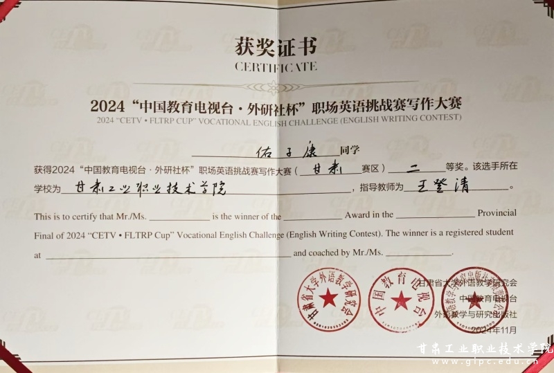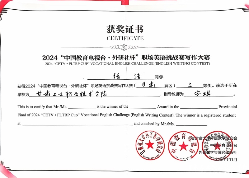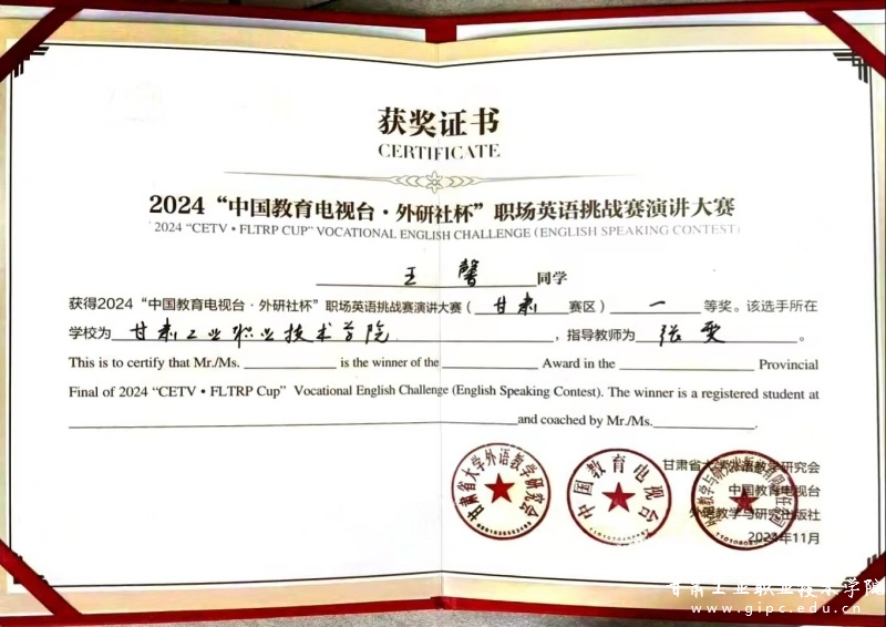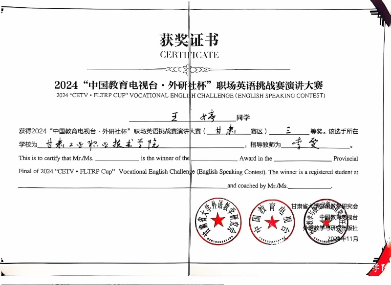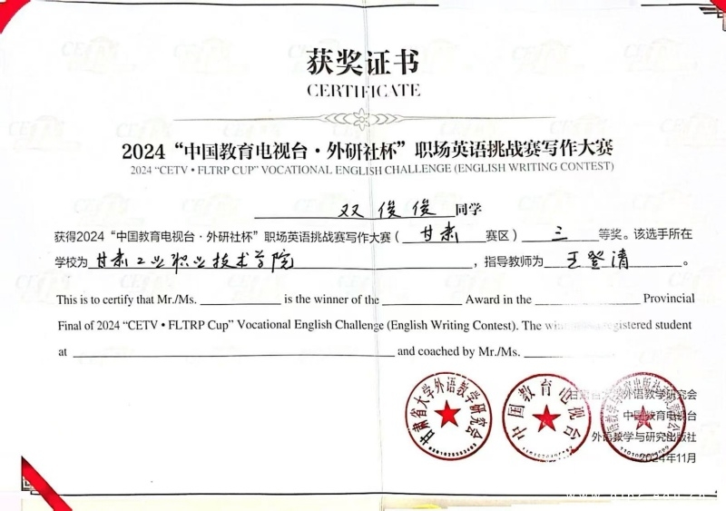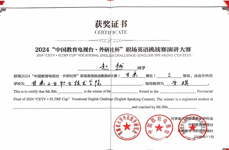 11月3日,2024年“中国教育电视台·外研社杯”职场英语挑战赛甘肃赛区比赛在兰州石化职业技术大学圆满落幕。来自全省13所参赛院校的指导教师和73名选手参加了此次比赛。Beat365学生王馨、佑子康在激烈的角逐中分别荣获演讲大赛一等奖和写作大赛二等奖,赵越、双俊俊、张洁、王婷荣获三等奖。