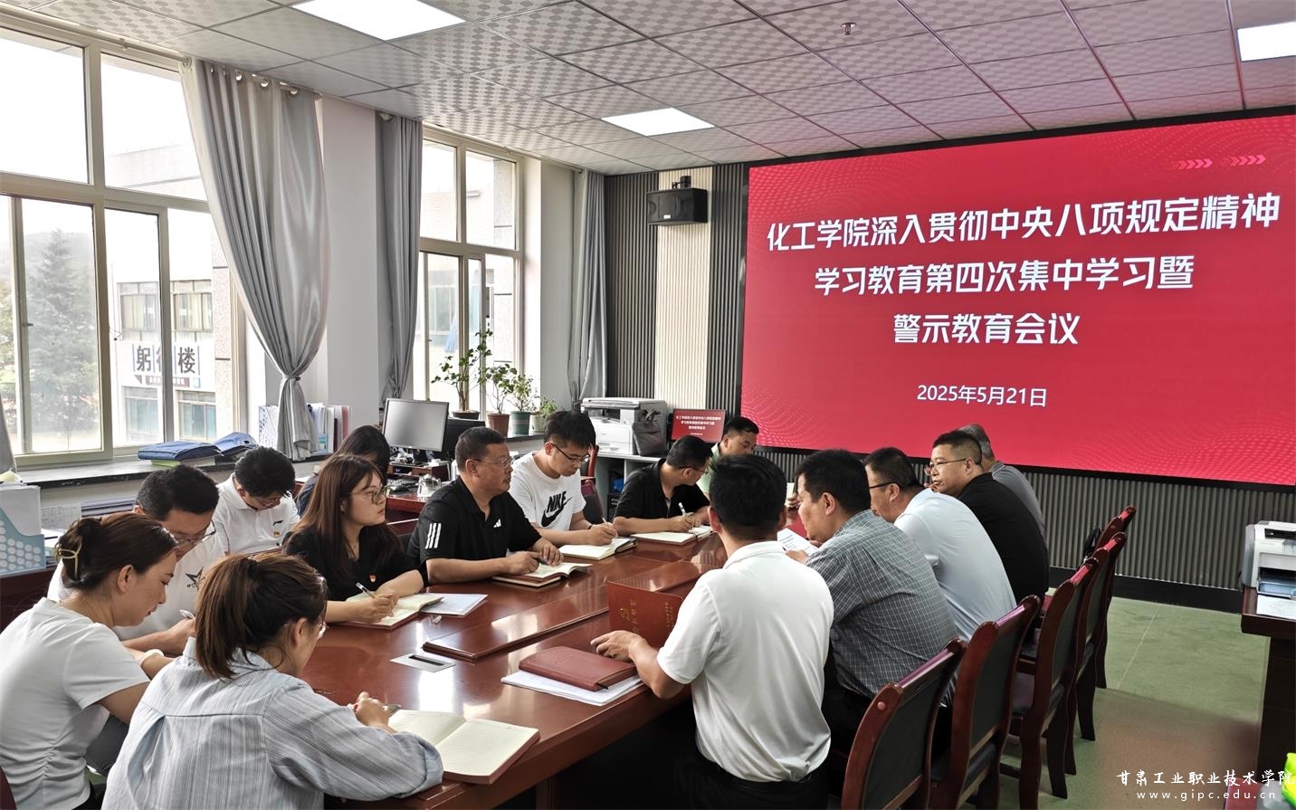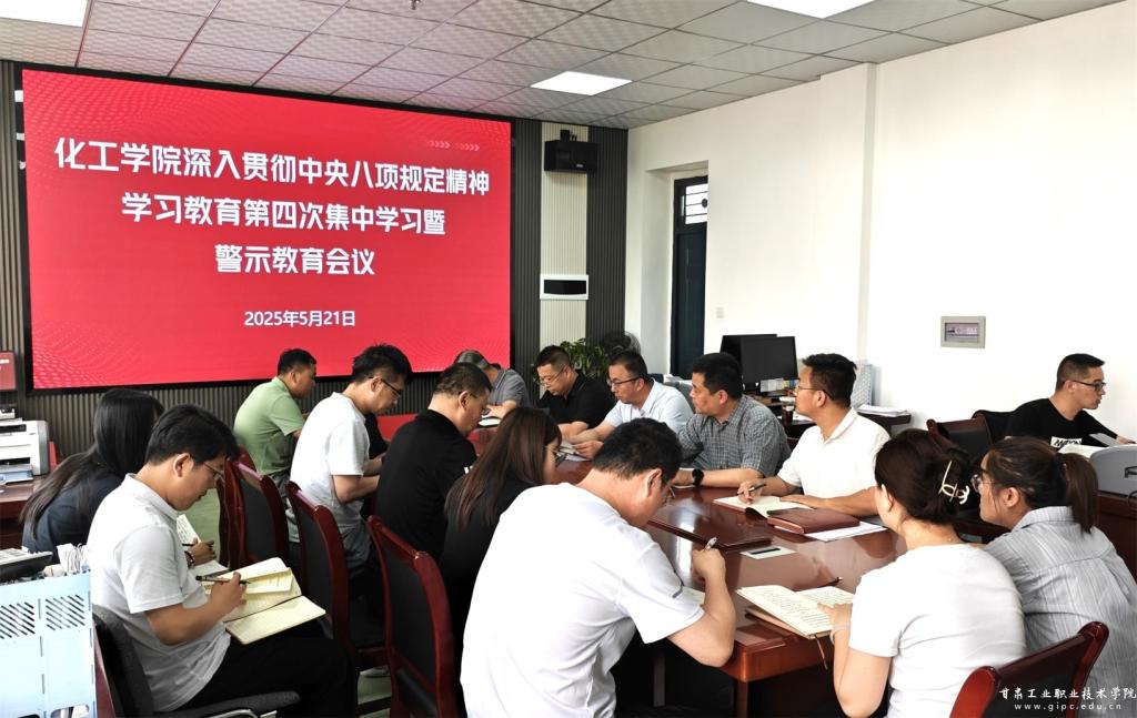 为进一步强化党风廉政建设,持续深化中央八项规定精神落实,筑牢党员干部廉洁自律思想防线,5月21日下午,化工学院党总支开展深入贯彻中央八项规定精神学习教育第四次集中学习暨警示教育会议。会议由化工学院党总支书记岳强主持,全体党员参加。
