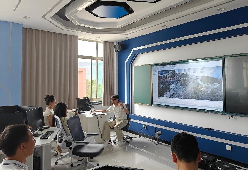 进入实操环节,技术人员在地质园演示了三维激光扫描仪的架设、参数设置、数据采集等操作流程,并指导教师们亲自动手实践。教师们积极参与,围绕仪器操作细节、数据质量控制、不同场景下的测量技巧等问题与技术人员展开深入交流。在地质园场景实测过程中,教师们熟练运用所学,成功获取了高精度的三维点云数据,初步构建出地质园的三维模型,对该技术的实践应用有了更为深刻的理解。
