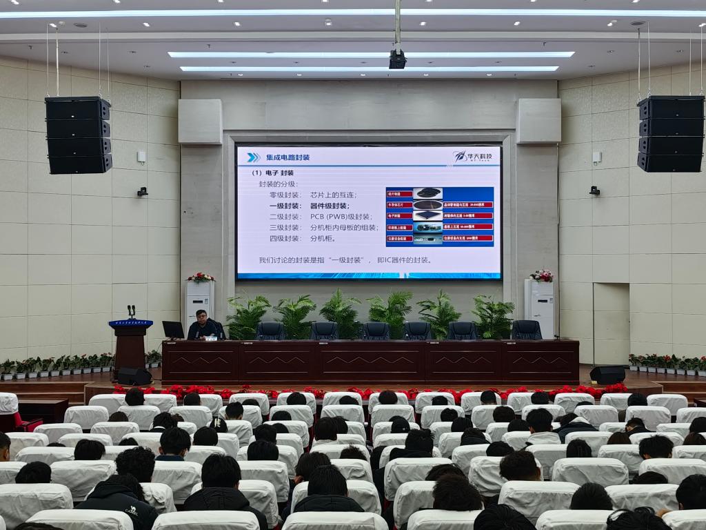 仪式结束后,吴永辉以《集成电路产业职业发展规划》为主题,为在场师生作了一场内容丰富、视角前瞻的专题报告。他系统介绍了集成电路产业的发展现状、封装测试技术的前沿趋势,以及华天科技在半导体封测领域的全球布局与技术优势。吴永辉还结合职业规划案例,引导学生树立正确的就业观,强调“平台选择”与“脚踏实地”的重要性,鼓励大家在我国半导体产业发展的浪潮中找准方向、实现自我价值。