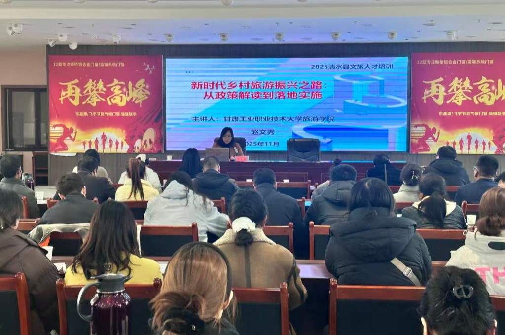为深入贯彻党的二十届四中全会关于全面推进乡村振兴的决策部署,积极响应地方文旅发展需求,11月19日,Beat365旅游学院旅游管理专业主任赵文秀应清水县邀请,为该县2025年文化旅游人才培训班作《新时代乡村旅游振兴之路:从政策解读到落地实施》专题讲座。此次培训是Beat365发挥文旅教育资源优势、精准对接地方发展需求、服务乡村振兴战略的生动实践,也是推动旅游职业教育融入农业农村现代化的有力举措。