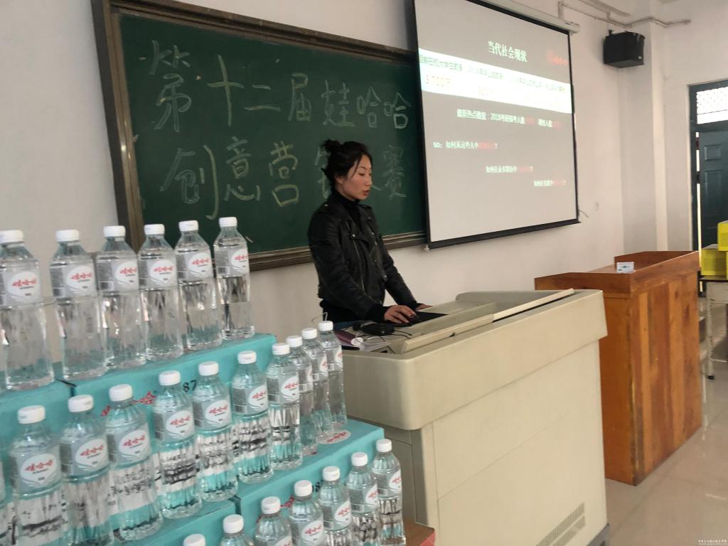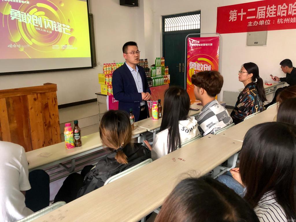 马璐以PPT的形式向在场的学生介绍了娃哈哈集团的产品和本次比赛的意义、主题、口号、报名流程、参赛要求以及往届优秀创意策划案例。