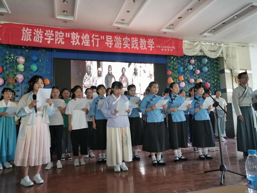 返校后,由学生全程策划组织并成功举行了“敦煌行”导游带团综合实训成果汇报成果以丝路西段部分景区导游词解说诗歌朗诵、裕固族舞蹈、小品等表现形式将导游讲解技能、导游才艺、带团业务技能等全方位进行了展示,再现了本次实践教学的内容及学生取得的进步