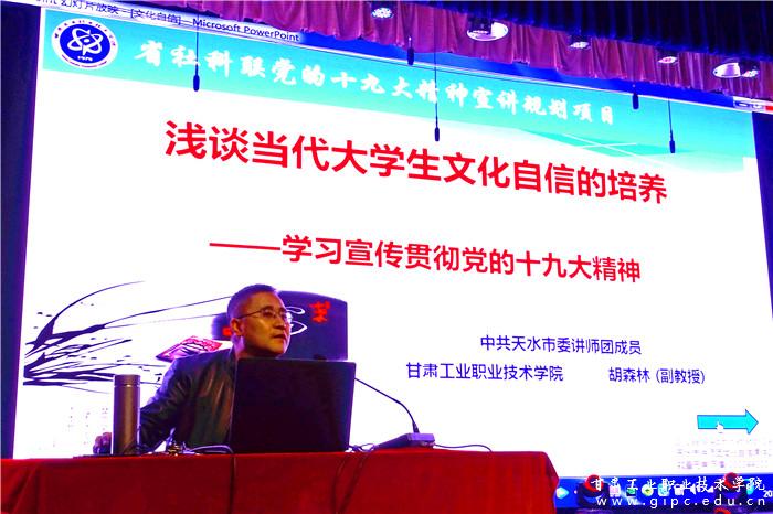 10月9日,校党委宣传统战部负责人胡森林在大学生活动中心为2019级学生作题为《浅谈当代大学生文化自信的培养》的形势与政策课专题讲座。
