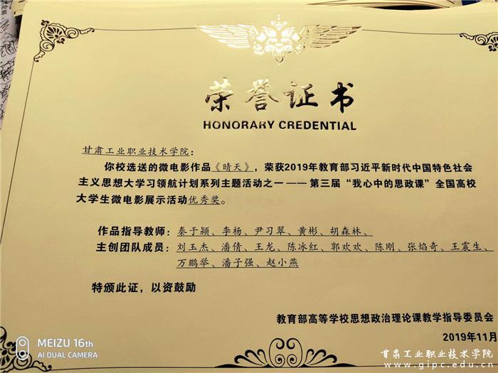 2019年教育部习近平新时代中国特色社会主义思想大学习领航计划系列主题活动之一——第三届“我心中的思政课”全国高校大学生微电影展示活动,Beat365报送的微电影作品《晴天》荣获优秀奖。