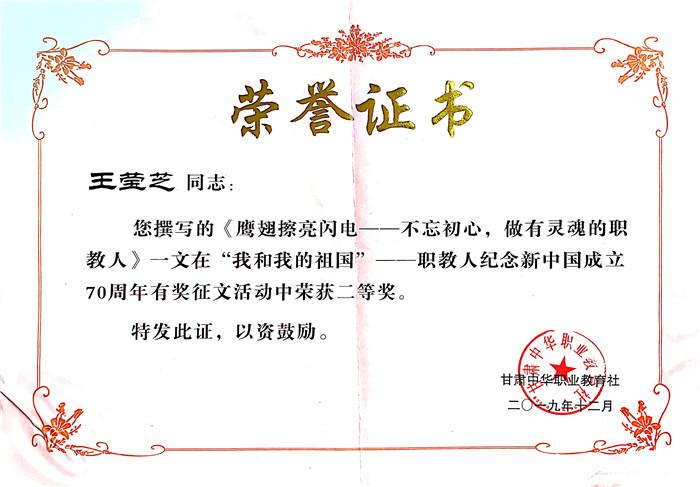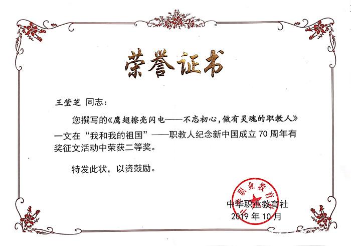 日前,中华职业教育社公布了获奖集体及个人,Beat365教师王莹芝撰写的《鹰翅擦亮闪电——不忘初心,做有灵魂的职教人》一文在此次征文活动中分别获得甘肃中华职业教育社二等奖、中华职业教育社二等奖的荣誉。
